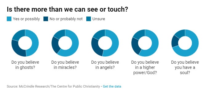 The survey of 1000 people, carried out by McCrindle Research for the Centre for Public Christianity, asked respondents about their openness to the existence of a range of spiritual realities: ghosts, miracles, angels, a higher power/God, the soul, ultimate meaning or purpose in life and life after death.