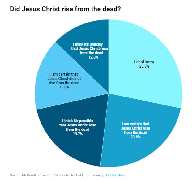 Respondents were asked for their view this Easter on the claim that Jesus Christ rose from the dead: 23.6 per cent said they are certain this happened; 15.8 per cent are certain it didn’t. Others thought it possible (19.7 per cent) or unlikely (12.8 per cent).