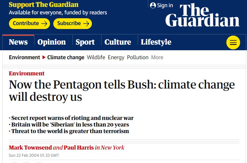 A secret report, suppressed by US defence chiefs and obtained by The Observer, warns that major European cities will be sunk beneath rising seas as Britain is plunged into a ‘Siberian’ climate by 2020. Nuclear conflict, mega-droughts, famine and widespread rioting will erupt across the world.