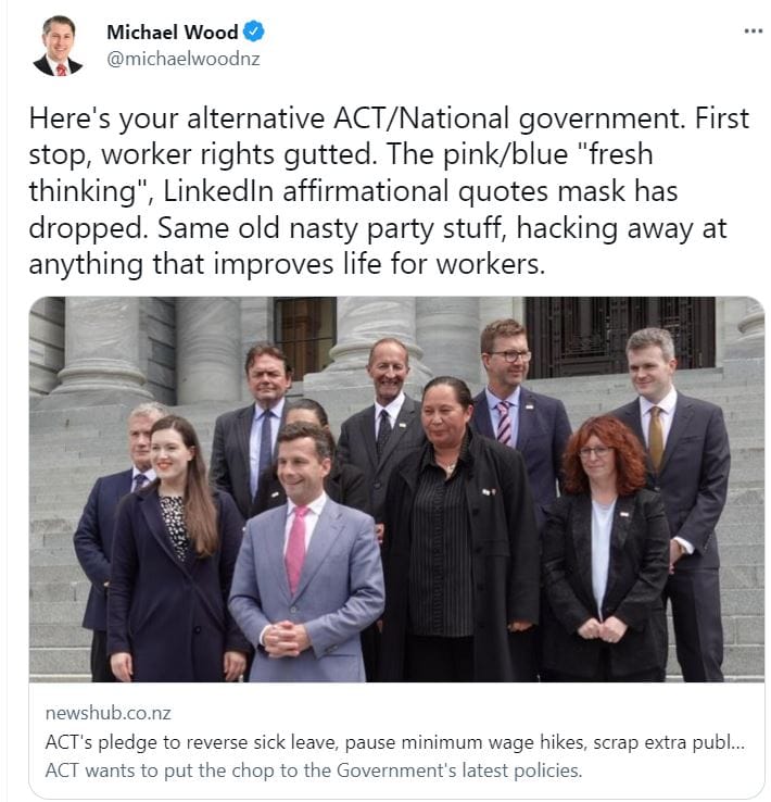 Michael Wood, rapidly becoming one of the ministers I despise most, accuses ACT of gutting workers’ rights, when workers who chose to be unvaccinated remain on the scrap heap as far as Labour is concerned.