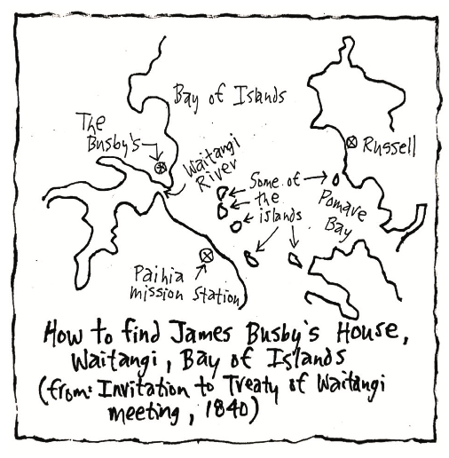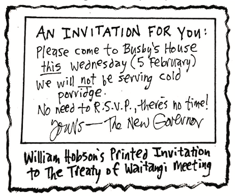 The next day he proclaims Russell the foundation of a new colony. Five days after arriving he has written out a treaty (with the help of Busby and his 1835 Declaration), had it translated into Maori by the missionaries (completed overnight on 4 February), and had notices printed inviting Maori chiefs to a meeting to be held outside Busby’s house at Waitangi on 5 February 1840, only seven days after he’d arrived. At best he’s allowed two days for the notices to be circulated and the “chiefs” to turn up (of course on a ship that’s plenty of time).