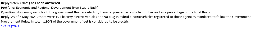 In answer to Written Questions from ACT, the Government has said it has 191 battery electric vehicles and 90 plug-in hybrid electric vehicles, just 1.9 per cent of the fleet.