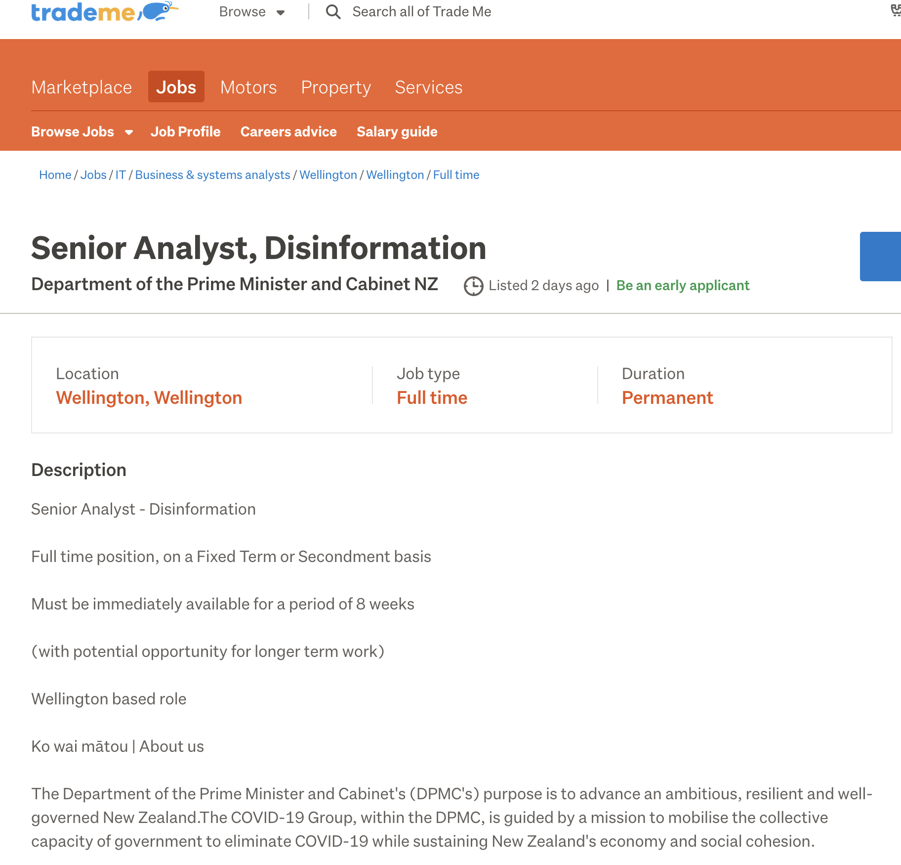 It is for the role of Senior Analyst, Disinformation. I kid you not. It is being advertised on Trade Me and on Government websites.