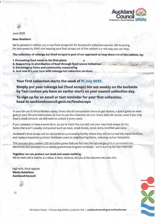 “Dear Resident,” it proclaimed in dark bold print, “we’re pleased to deliver you a new food scraps bin for Auckland’s collection service. We’re aiming for zero waste by 2040 and keeping your food scraps out of the rubbish is a real way you can help.” Read on if you choose: