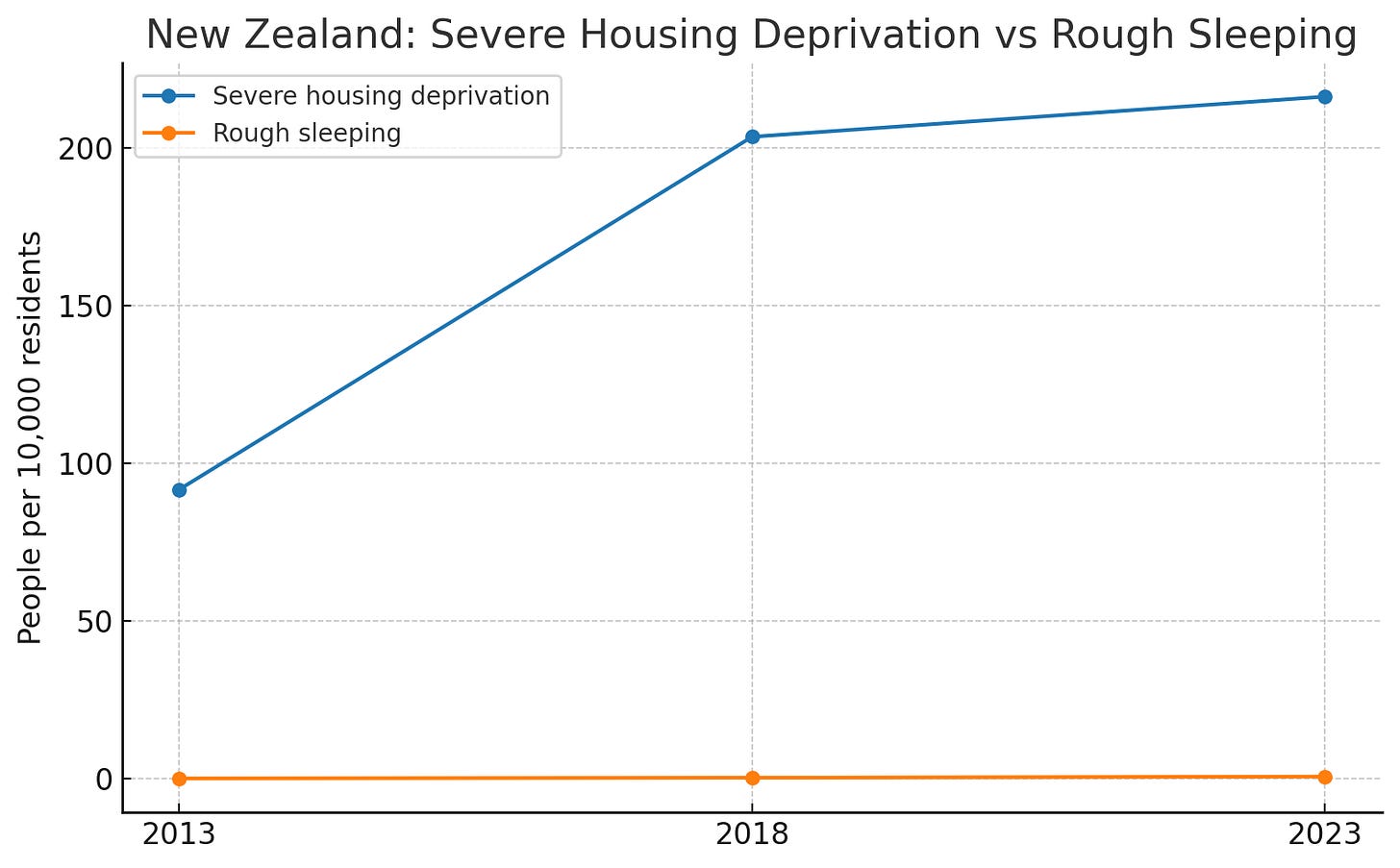 Statistics NZ doesn’t actually publish a ‘homelessness’ figure in the narrow sense that most OECD countries do. Instead, we have a measure called “severe housing deprivation”, which is much broader. It includes three groups: people without shelter (rough sleepers), people in temporary accommodation such as motels and night shelters, and people living in uninhabitable housing like garages or sheds. This is a useful measure for social policy, but it’s not what most people mean when they think of ‘homelessness’ in an international context.