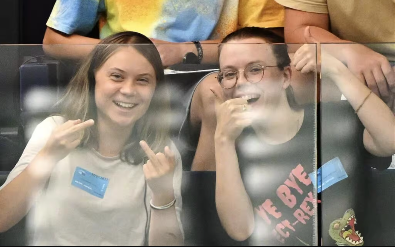 Greta Thunberg was photographed at the European Parliament in Strasbourg last Wednesday smiling broadly while flipping a double-bird – apparently to the opponents of heavily contested new EU environmental legislation known as the “Nature Restoration Law”.