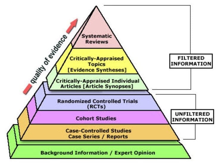 Delphi studies involve expert panels of stakeholders who conduct meetings, surveys and interviews before coming to a consensus view. Expert opinion is the lowest level of evidence on the pyramid of hierarchical evidence for scientific studies.