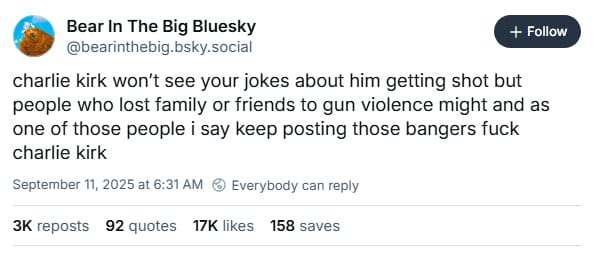charlie kirk won’t see your jokes about him getting shot but people who lost family or friends to gun violence might and as one of those people i say keep posting those bangers fuck charlie kirk