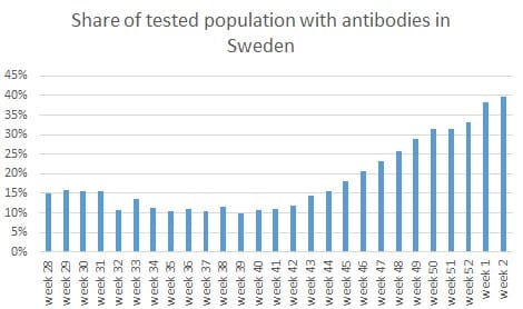 After an initial reduction, the proportion with antibodies stabilized at around 10% in August, and stayed that way until October, when it started to rise, in line with the beginning of the second wave. And it’s literally kept rising by a percentage point or two, every week, all autumn and winter so far. In the second week of January 2021, 40% of those tested in Sweden had antibodies to covid.