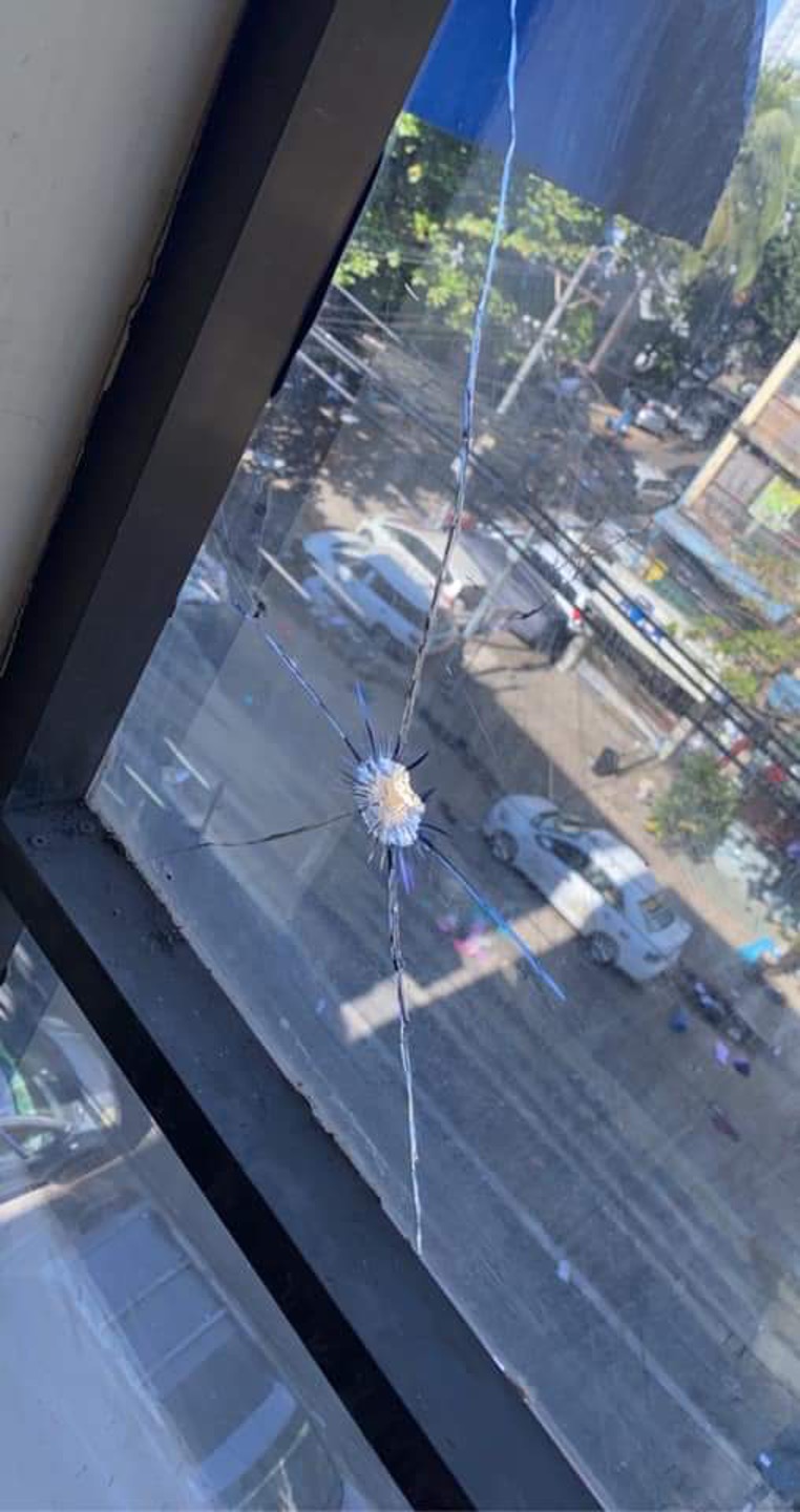 The picture below shows the damage done to the windows of a flat after shots or catapults are fired from police in the road. The occupants are frightened but resolute in their opposition. This police tactic is designed to instil terror into the population and deter people from watching from their windows and recording incidents. But still the people do it.
