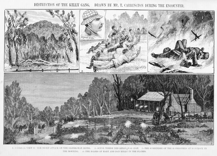 As the siege continued into the early hours, the journalists recorded the wails of the Glenrowan Inn’s matron, Ann Jones, when her son was shot, as well as the eerie tapping of Kelly’s gun on his helmet, which Carrington wrote sounded like “the noise like the ring of a hammer on an anvil”.