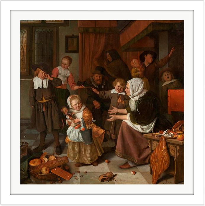 the grown-ups have organized the occasion to entertain the children: it is the feast of St Nicholas, the ancestor of “Santa Claus.” Steen catches the moment when the parents are helping the children to find the toys which they have hidden all over the house for them. Some of the children have already found their toys. Some little girls are holding dolls. Others are carrying buckets full of toys. There are some shoes lying about: perhaps it was already customary to hide toys in shoes, those shoes which children of the 19th and 20th centuries, in some countries, put in front of the fire on Christmas Eve? This is no longer a great collective festival, but a quiet family celebration; and consequently this concentration on the family is continued by a concentration of the family around the children. Family feasts became children’s feasts. [emphasis added]