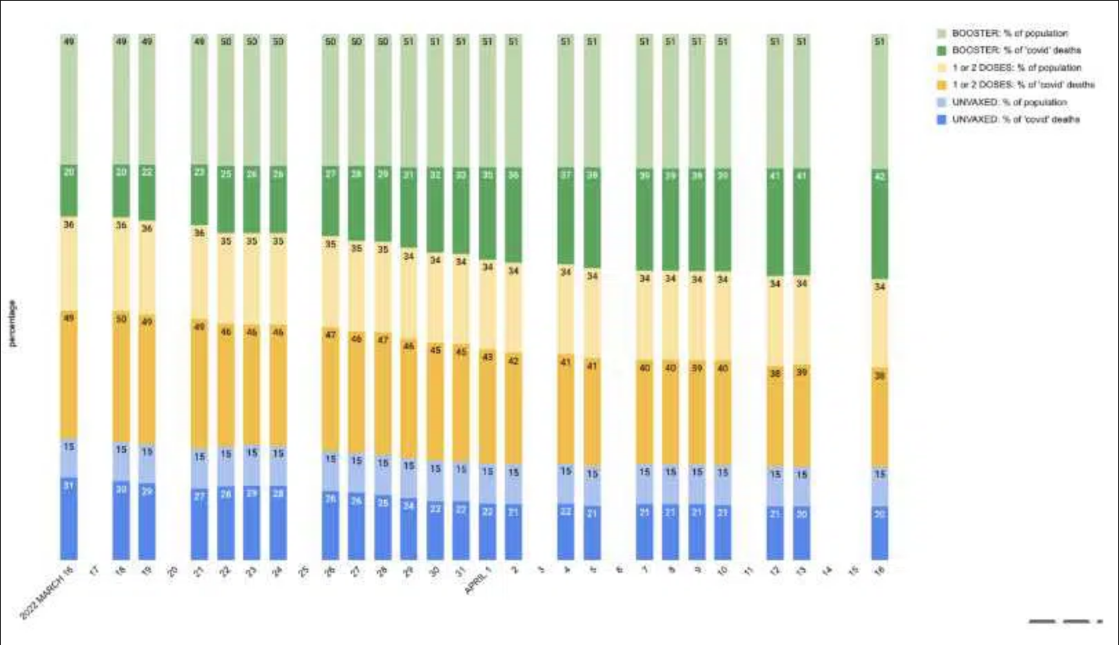 The proportion of covid deaths by vax status (dark colours) with Proportion of total population in each vax status (light shades)