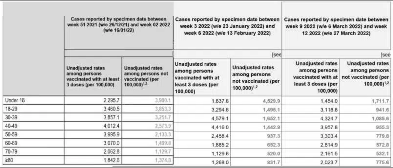 We can however segway to figures from the UKHSA. Up until the end of March, the UKHSA conveniently provided the case rates per 100,000 individuals by vaccination status in their vaccine surveillance reports, and the following table has been stitched together by online UK publication The Expose from the case-rate tables found in the Week 3, Week 7 and Week 13 Vaccine Surveillance Reports.