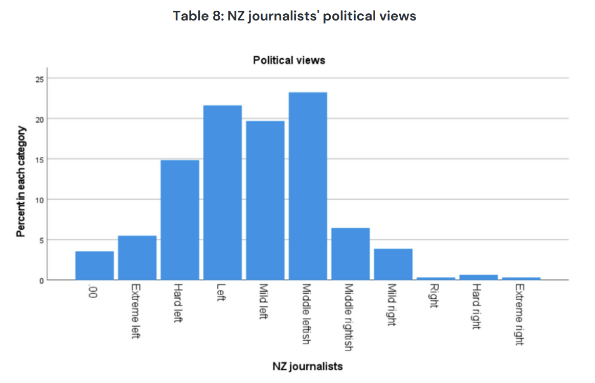 If you look at those who say they range from left to extreme left (42%) to those who range from right to extreme right (1%) it shows how the worldview of most journalists is out of kilter with society. They are so far left they think soaking-wet liberals like Christopher Luxon, Chris Bishop or Nicola Willis are to the right of Genghis Khan and Attila the Hun.