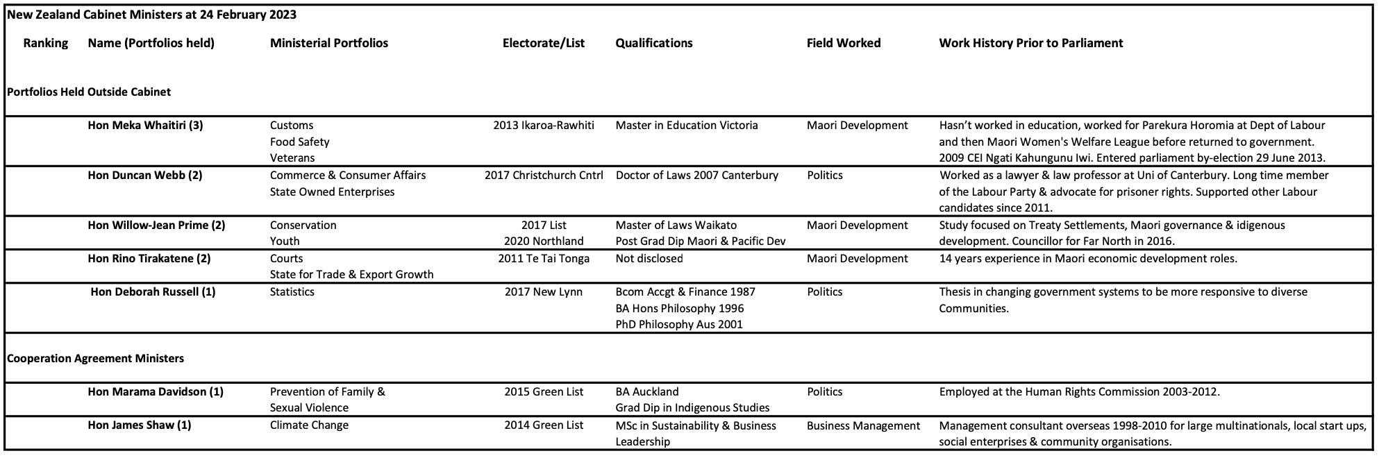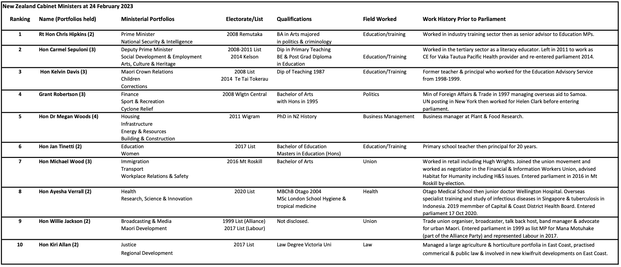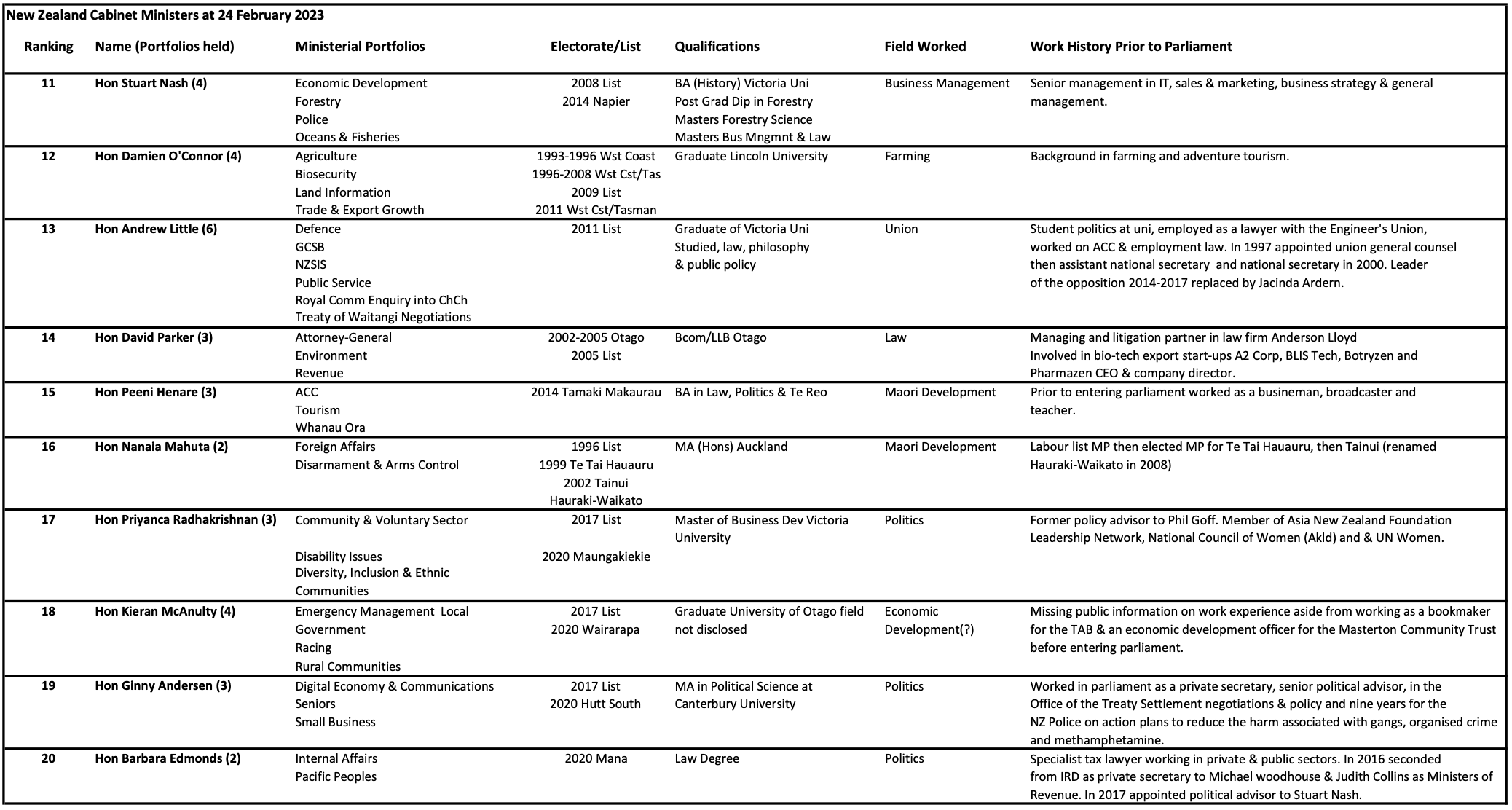 From Ministerial biographies and Wikipedia pages I have compiled spreadsheets listing each Minister’s tertiary qualifications, employment experience, party ranking and when they entered parliament.
