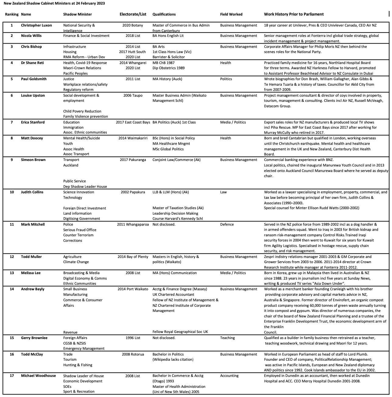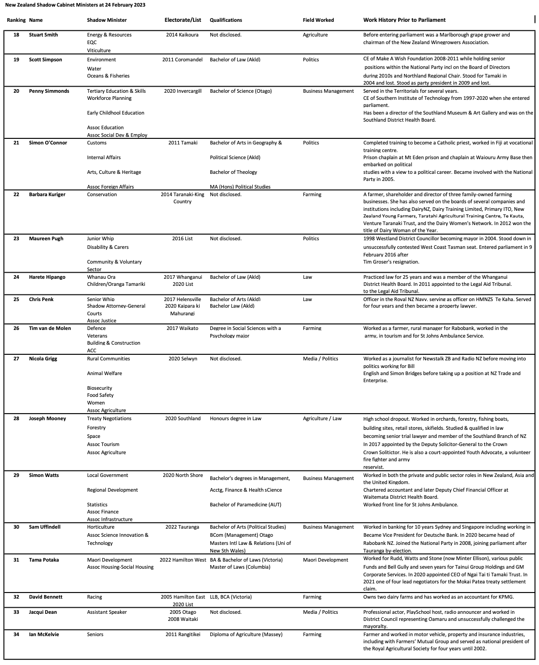 An analysis of National’s 34 shadow Ministers reveals that 27 Ministers hold university qualifications in Art (8); Law (5); Commerce (5); Art/Law (2); Law/Commerce (2); and Political Science (1). Gerry Brownlee, Mark Mitchell, Stuart Smith, Barbara Kuriger, Maureen Pugh, Nicola Grigg and Jacqui Dean have not disclosed their tertiary qualifications.