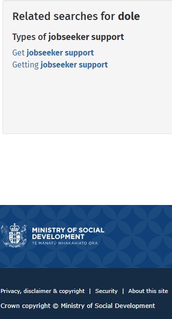 Hmmm, that ‘MyMSD’ login looks suspiciously like it might have something to do with the Ministry of Social Development. Let’s check the footer of that “search for ‘dole'” page: