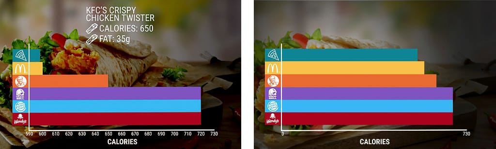 When KFC used a graph to illustrate the amount of calories in a Chicken Twister compared to, say, a Wendy’s burger, it looks as if the one has half the calories of the other. But note where the X axis starts. When you see the full X-axis from zero, it’s obvious that there’s very little difference between them.