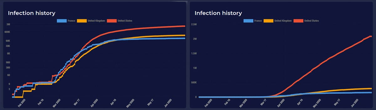 “Logarithmic” means that each increment on the axis is multiplied from the last by a factor of 10 (e.g., 100, 1000, 10000, 100000 etc.). This can be very useful for presenting big numbers, but it can also be very misleading. Compare these two graphs. Same data – one on a linear scale, the other logarithmic.