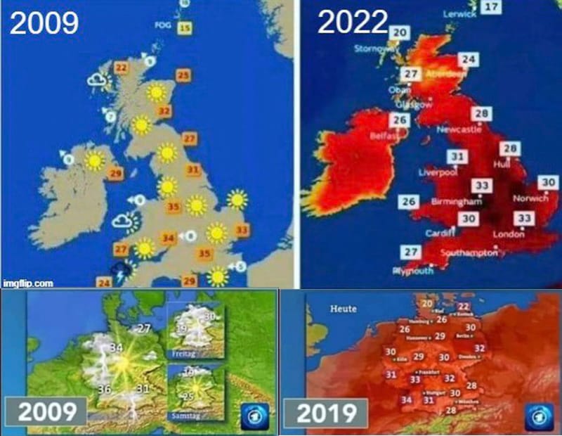 Another, particularly notorious, example is weather agencies using alarmingly-coloured maps to push their ‘climate crisis’ message. As comparison shows, earlier forecasts simply showed simple topographical maps with temperatures and innocuous symbols. More recently, though, in tandem with ramped-up legacy media hysteria over a supposed ‘climate emergency’, forecasts changed to ‘heat maps’, all alarming reds and oranges (‘hot’ colours’). As the comparisons show, despite having near-identical temperature ranges, the later maps are far ‘scarier’.