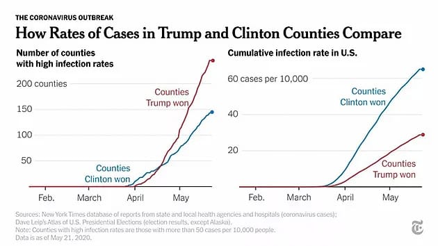 Even with much less subjective data, such as Covid-19 infections, data selection can tell two completely different stories. If you select merely the counties with high infection rates and then break them down by Trump or Clinton voters – oh! those idiot Trumpsters. But, if you compare different-voting counties to the total cumulative infections in the US – well, now it’s the Clintonistas’ turn to look pretty dumb.