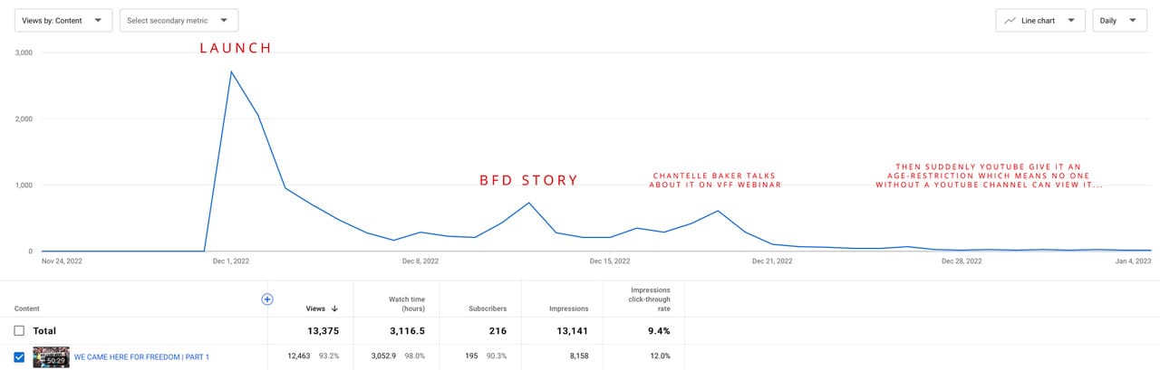 Check out the screenshot I’ve attached below. In it, you’ll see how the launch of my film – We Came Here for Freedom (about the NZ Freedom convoy and the Wellington protest) – has been suppressed. It went under the radar for almost a month. Then suddenly, after Chantelle Baker mentioned it in a VFF webinar (causing a little boost in viewership), it got an age restriction slapped on it, which effectively made it non-viewable on Youtube for most users and flatlined its viewership.
