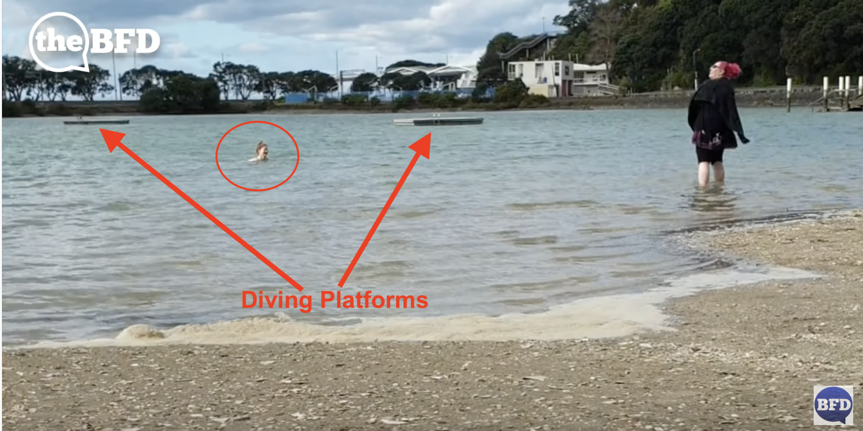 - That Judges Bay is “super shallow”, despite there being two diving platforms behind Dr. Gaston who was up to her neck in the water.