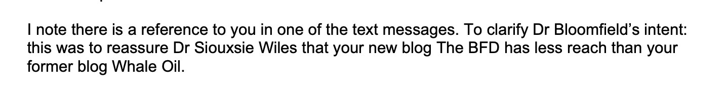 So, far from being a story of how Dr Bloomfield sledged me and The BFD by stating that we didn’t “have much cred” these days, it should have been about how a senior public servant, and one of the faces of the Covid campaign, conspired together in a concerted effort to protect, defuse and deflect from the lies and actions of Siouxsie Wiles.