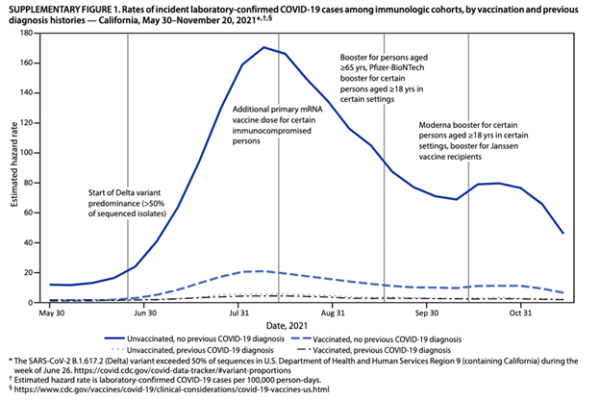 The CDC’s MMWR is a weekly report. The chart above is part of the report for the last week of January, and it was for only two of the 50 states, California and New York. When I was writing my Feb. 5 article, I thought that maybe it was a benign omission that the CDC did not conclude the obvious. For sure, more data would be coming from the CDC in February and March, I thought, as it would teach us so much more about natural immunity.
