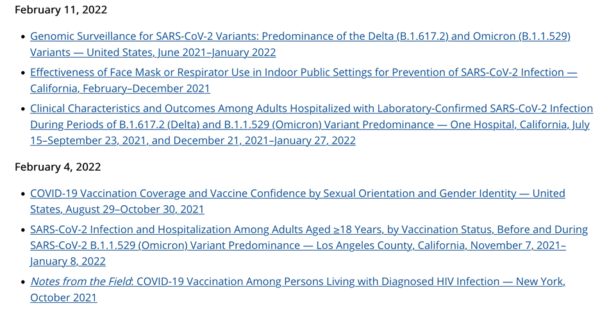 However, it hasn’t materialized. Since Jan. 28, there have been 10 MMWR reports published on the CDC website, totaling 29 articles in all. They cover topics ranging from vaccination by geographic locations, to vaccine confidence by sexual orientation, to isolation strategy for fully vaccinated NFL players, and so on. So far, the Jan. 28 report was the only one that included “unvaccinated, with previous diagnosis” in the data, and that’s unfortunate. All the other reports were to re-enforce the conclusion that vaccines are effective, with almost nothing about natural immunity. Here is a screenshot of the MMWR website: