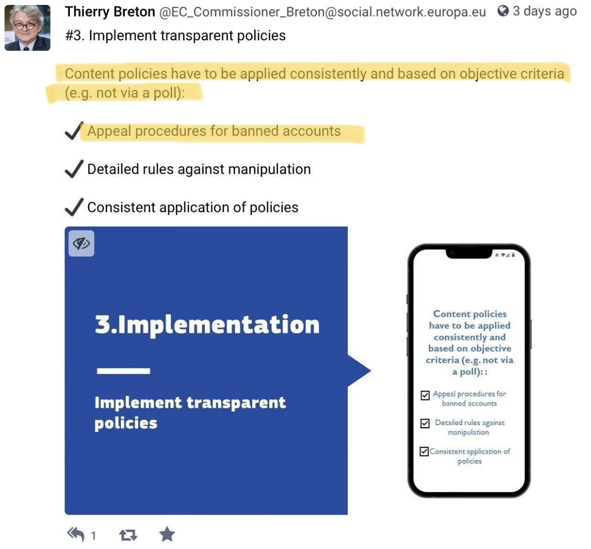 For further details on what exactly the EU Commission is demanding of Musk and Twitter to demonstrate compliance, Breton coyly links to a Mastodon thread containing a “DSA Checklist.” Item #3 (see below) amounts to a not-so-subtle reprimand of Musk for having proposed a general amnesty and, in particular, for having done so on the basis of the “Vox Populi, Vox Dei” principle. It calls merely for “appeal procedures for banned accounts” – i.e. no “amnesty,” whether general or partial – and insists: “Content policies have to be applied consistently and based on objective criteria (e.g. not via a poll).”
