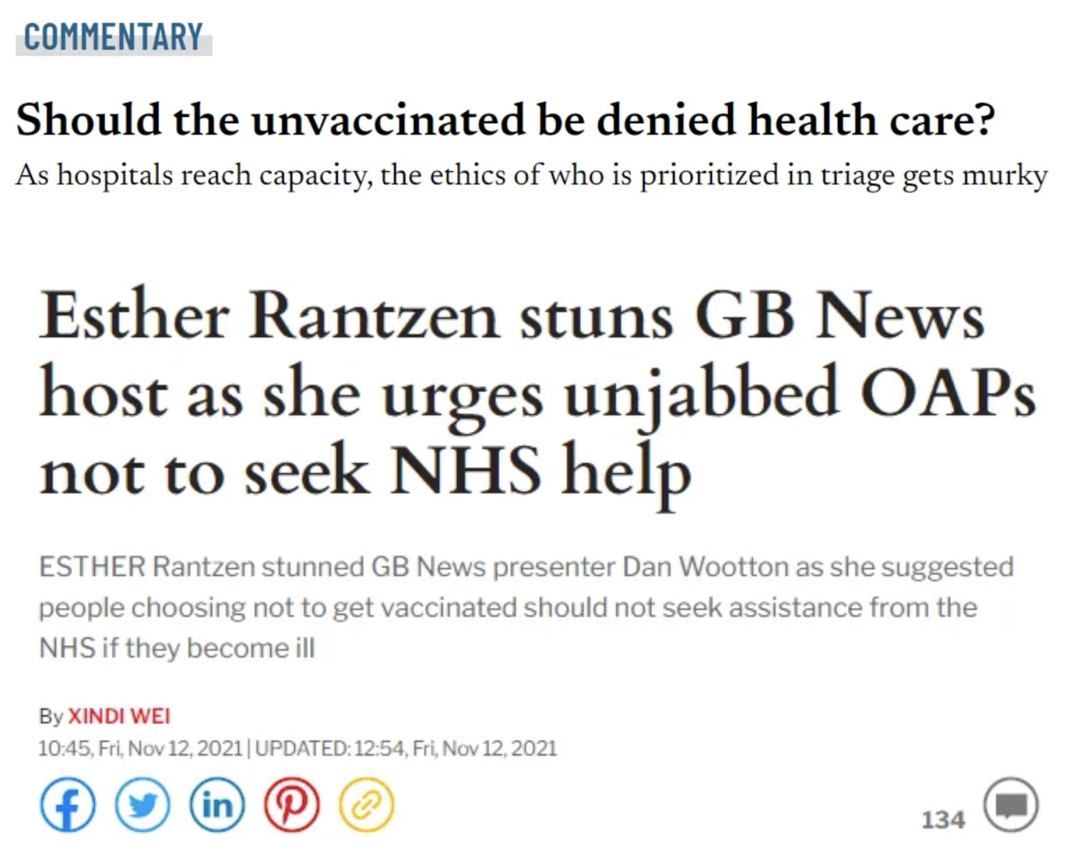 A particularly disturbing idea that began to gain serious traction among the elite commentariat was to have hospitals triage emergency care to serve the unvaccinated last, or even deny healthcare to the unvaccinated entirely – a fairly clear-cut crime against humanity.