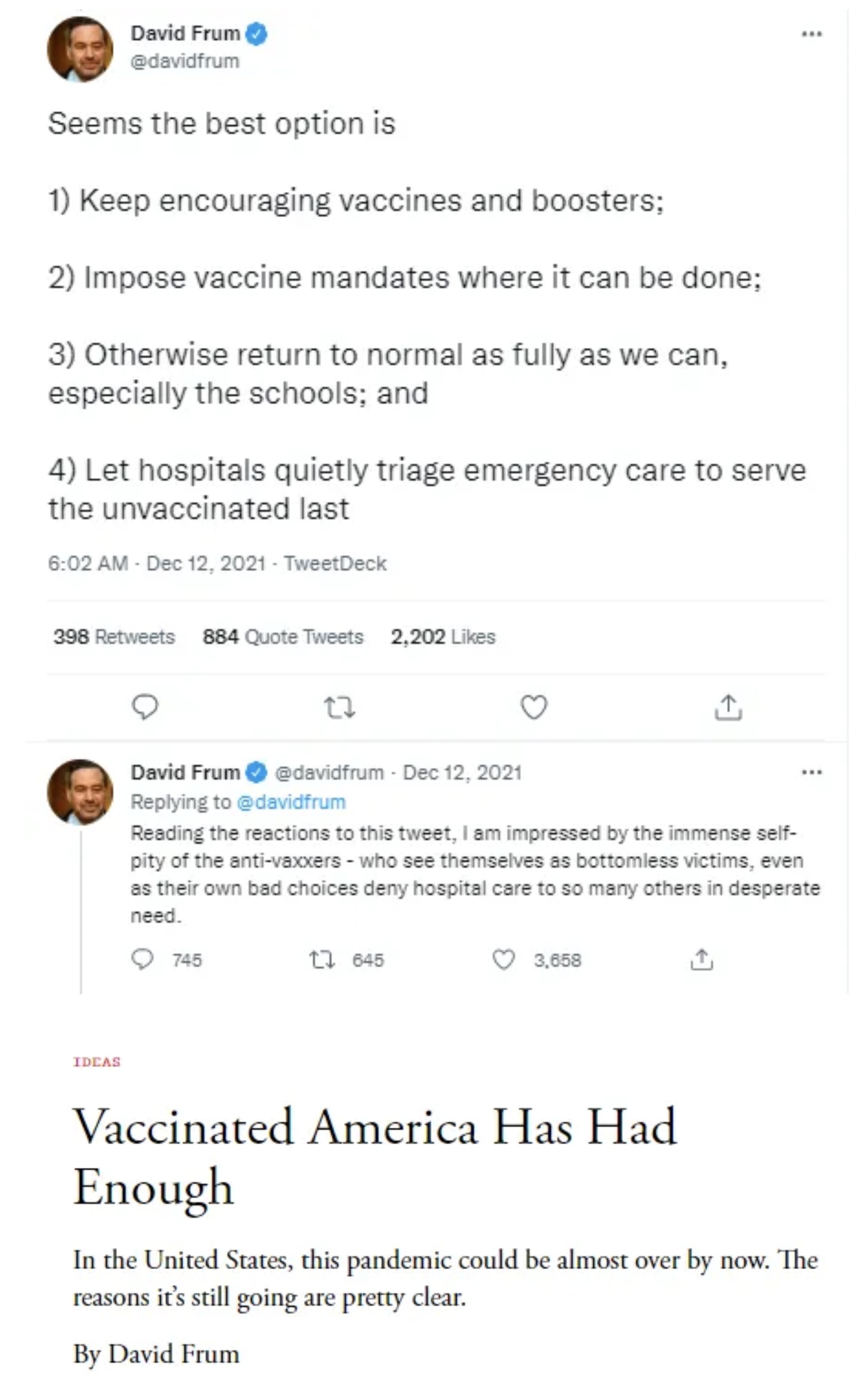 One vocal proponent of the idea of triaging emergency care to disfavor the unvaccinated was David Frum, senior editor of the Atlantic, most famous for his outspoken support for the invasion of Iraq. When his infamous tweet on the subject sparked an uproar, Frum doubled down.
