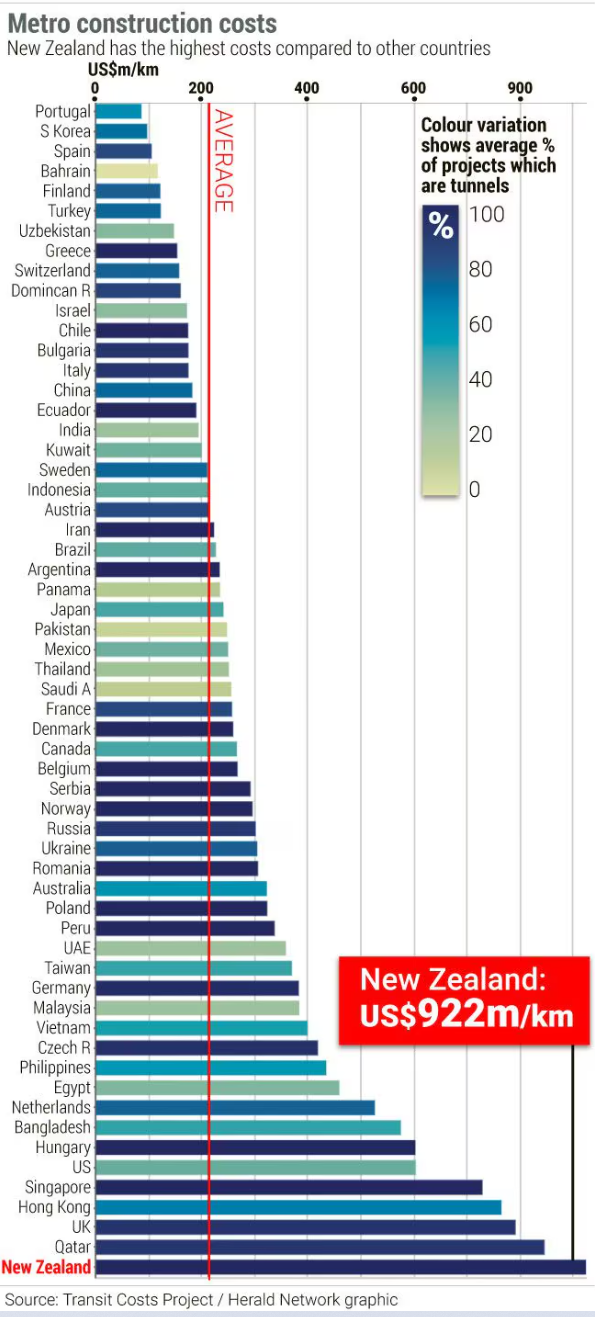 The problem is illustrated in this graph from the New Zealand Herald about city rail infrastructure. New Zealand is the most expensive country in the world: four times the OECD average.
