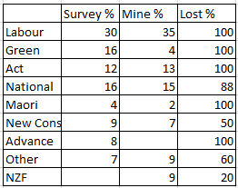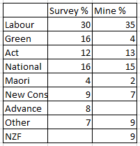 Clearly, I missed a few Greens and collected a bunch of NZ First voters that were missed by the professionals. But all told, my sample was pretty close to the professional survey results. Their Advance+Other (15%) was close to my NZF+Other (18%).