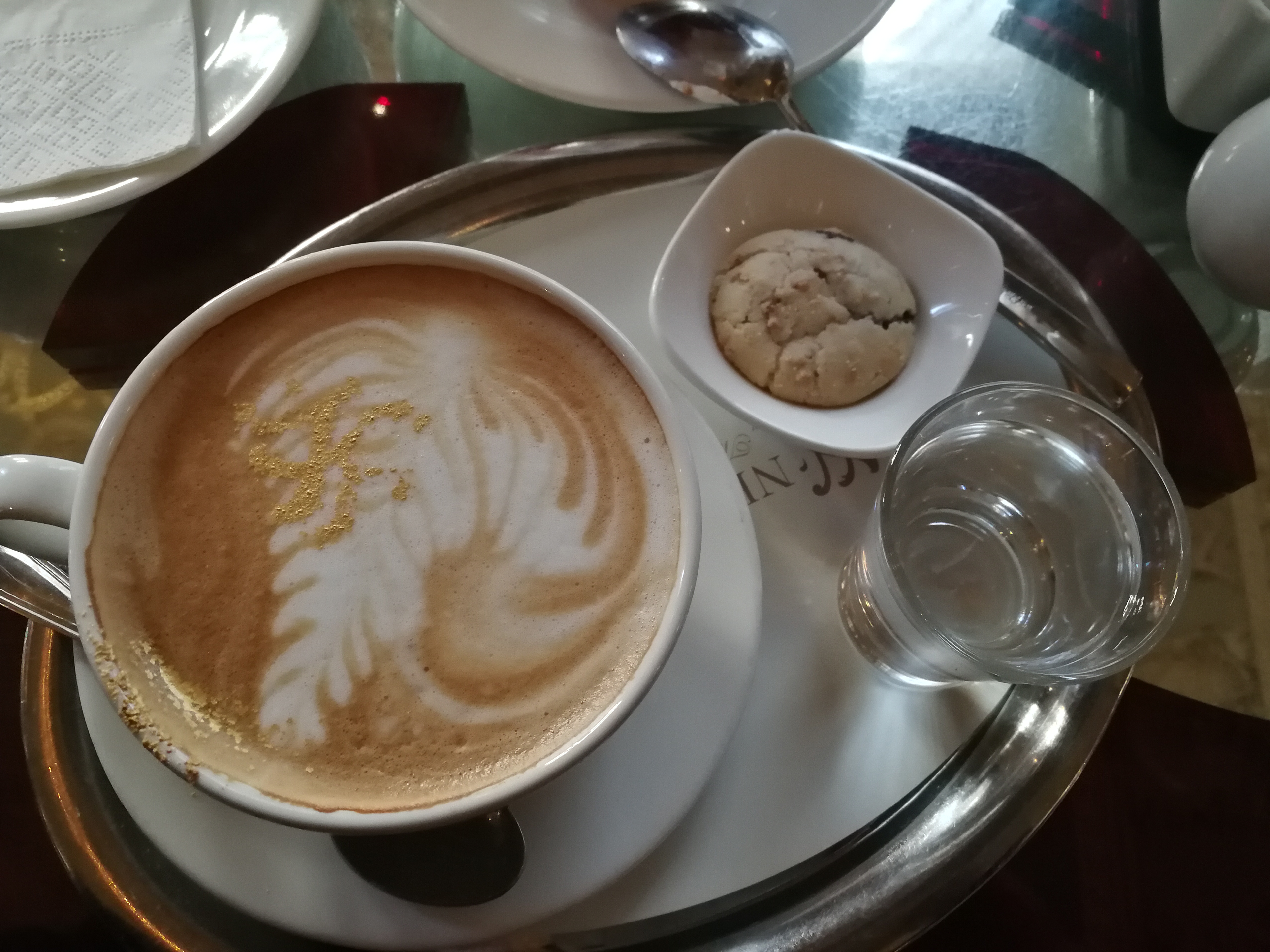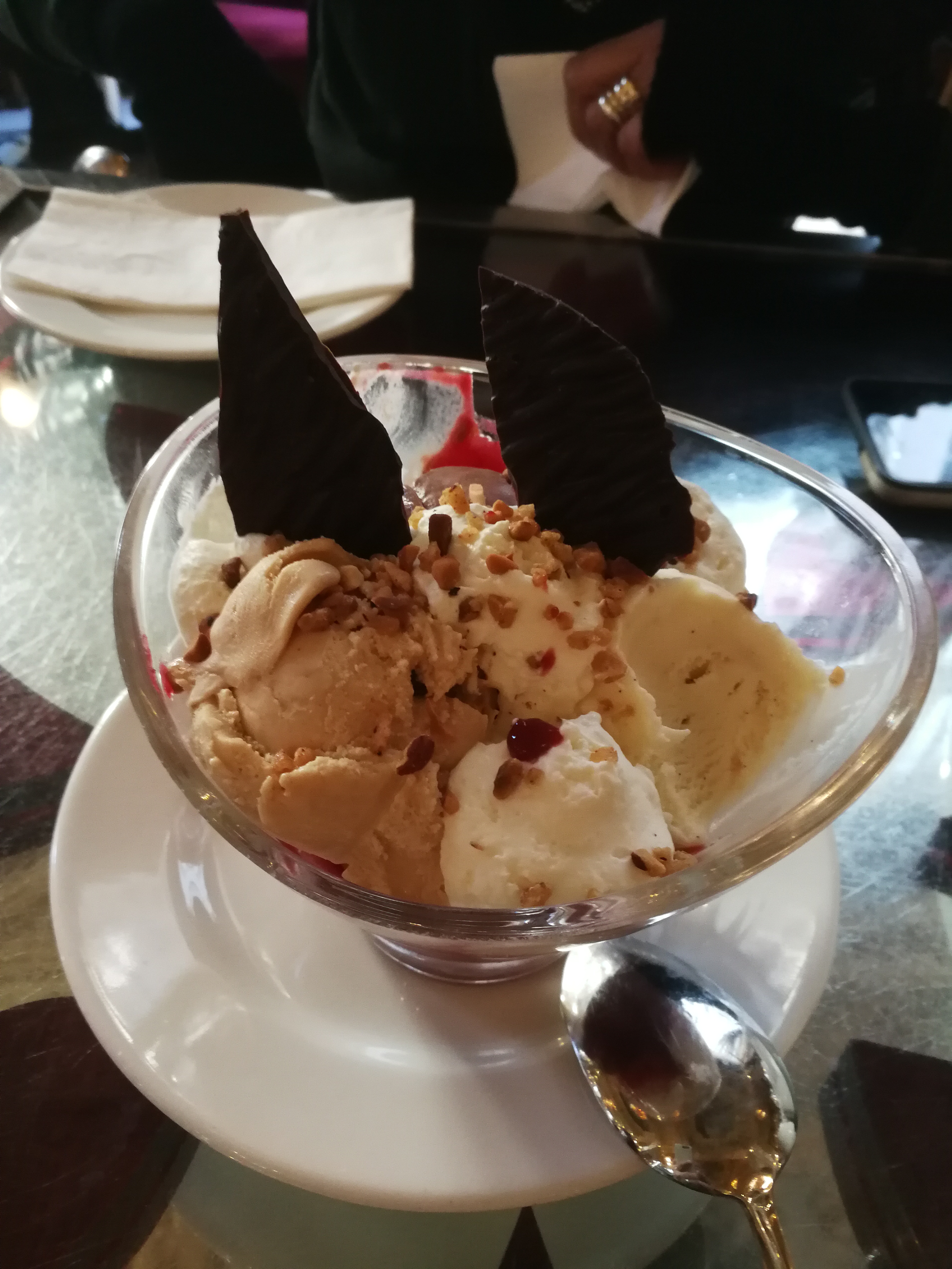 Service was perky and prompt; the menu itself was pretty unimaginative. We shared an ice cream sundae along with a “Gold Cappuccino” and a “Gold Hot Chocolate”. Both drinks arrived with gold dust sprinkled on top, good for both a laugh and a selfie. Everything was great and very pricey, but this was one of those Mount Everest moments, not to be missed.