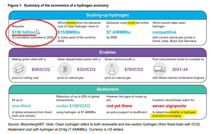 In March 2020 BloombergNEF produced a paper about the future of hydrogen. It contained a very informative graphic in the opening pages, backed by the quote below.