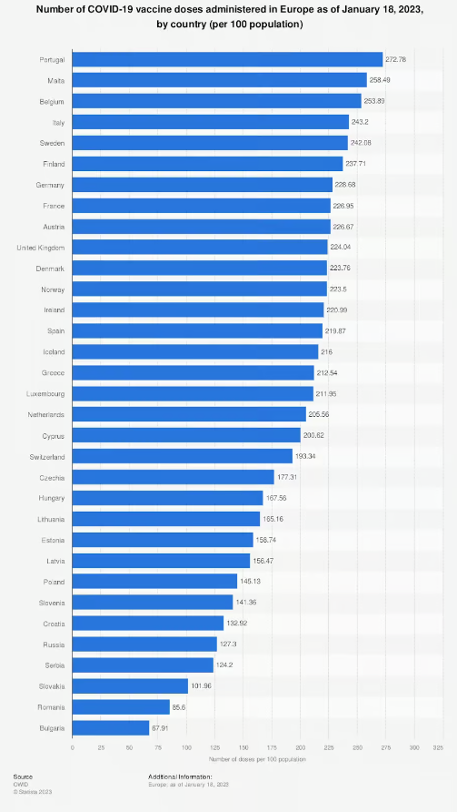 But the opposition to the Covid measures has been spectacularly wrong-footed in citing such data, since if Sweden did indeed resist lockdown, it by no means resisted mass vaccination. As the below Statista graph illustrates, Sweden in fact had one of the highest Covid-19 vaccination rates in Europe.