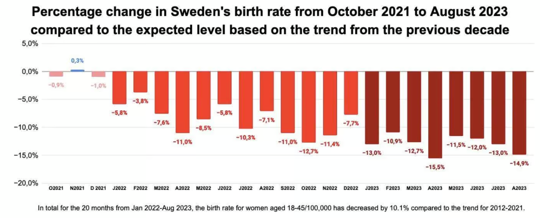 As can be seen in the below graph from the Läkaruppropet group, Swedish birth rates have been below the prior 10-year trend for no less than twenty months now and the Swedish birth shortfall has gotten progressively worse, reaching a low of -15.5 per cent in April of this year and standing at nearly -15 per cent according to the latest figures. The Läkaruppropet doctors point out, moreover, that the decline in Swedish birth rates began after COVID-19 vaccinations were rolled out to women of childbearing age.