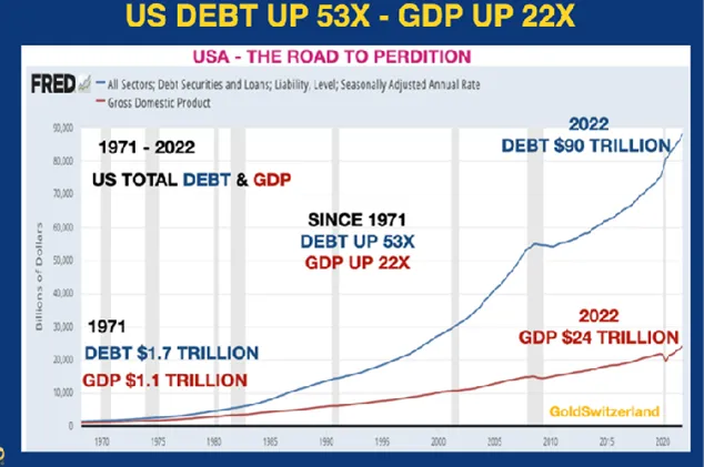 Since 1971 total US debt has gone up 53X with GDP only up 22X as the graph below shows: