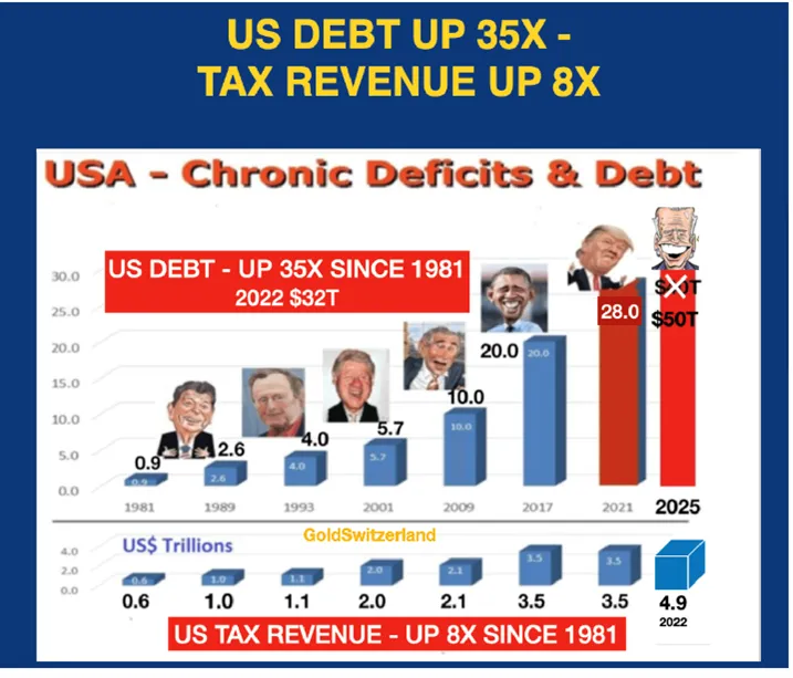 But if we look at the graph above again, it shows that debt has gone up 35X since 1981 but that tax revenue has only increased 8X from $0.6t to $4.9t.