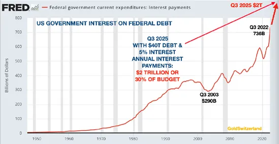 Even worse, with US interest payments on the debt surging from around 0% to probably 5% by 2025 the interest on the debt will climb to $2 trillion or circa 30% of the annual budget.