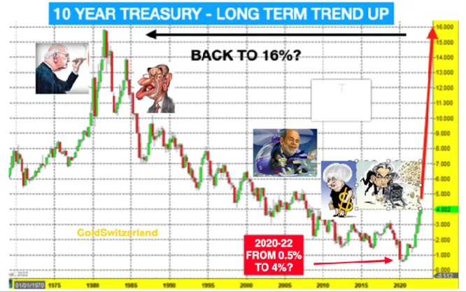 In my view this will not happen except for possibly very short term. The 40-year interest rate downtrend finished in 2020 and the world is unlikely to see low or negative rates for many years or decades. High inflation and high rates will continue for years. But as we see in the 40 year chart of the 10 year US treasury below, there will be many corrections in the coming uptrend.