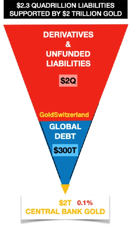 The estimated $2 quadrillion gross derivatives is today quasi debt but will one day become real debt, as central banks attempt to rescue the financial system. When counterparties fail, the gross will remain gross. So in total the world will face a $2,3 quadrillion debt resting on $2 trillion of central bank gold, a 0.1 per cent coverage.