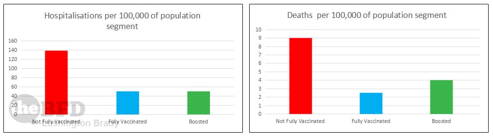 The data is therefore absolutely clear: being vaccinated or boosted makes it nearly one-third less likely that you will be hospitalised from covid. Being fully vaccinated makes you one-quarter as likely to die. Being boosted only improves that to about half as likely, but given that the most vulnerable are also the most likely to be boosted might skew that figure.