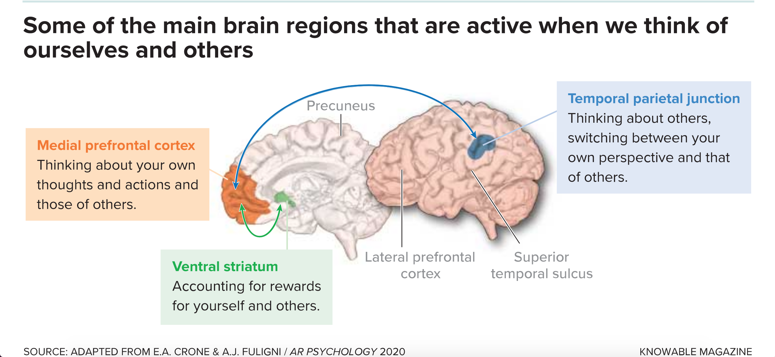 The social brain network, four regions in the brain that are consistently active when you think of social situations, is very robustly found across hundreds of studies. One of these areas, the medial prefrontal cortex, is also strongly engaged when you think about yourself, so this region appears to be involved in both.