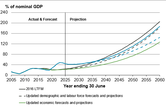 Our own Treasury regularly does long-term projections of what government debt would look like if current trends continue – with a steadily ageing population demanding both income support and steadily higher levels of healthcare, and the birth rate now well below the replacement rate. Their latest project, released in September, suggests that on current policies and demographic trends, net government debt will rise from 34% of GDP this year, to 43% by the end of this decade, to 84% by 2045 and to 197% by 2060.