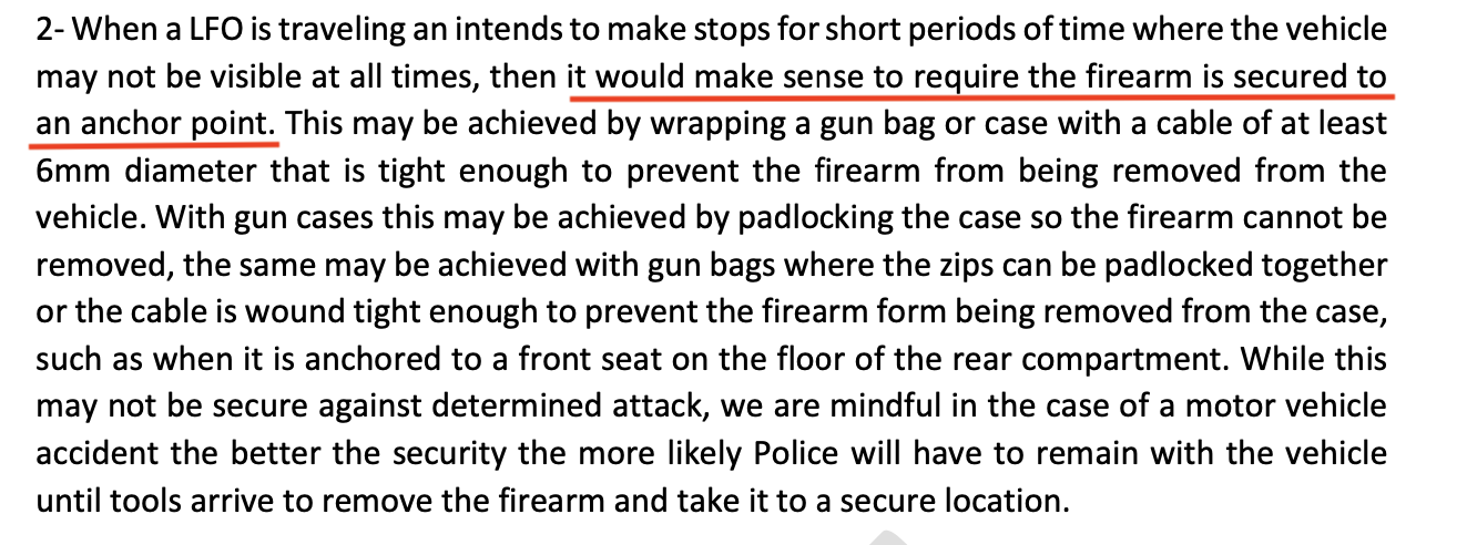The single most stupid part of their submission was this one, in response to a Police suggestion that firearms being transported in vehicles be secured to an anchor point: