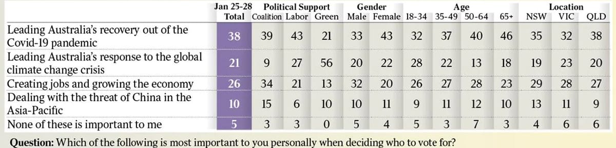 The only small comfort for Morrison might be that the Newspoll’s questions on “key issues” were clearly slanted: instead of allowing respondents to nominate their own issues, they presented a curated selection. Notably, on key issues of economy and China, the Coalition clearly leads.